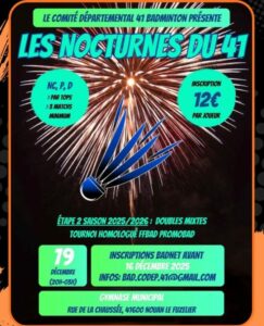 Nocturnes du codep 41 ! 2ème étape à Nouan-le-Fuzelier Vendredi 19 décembre Promobad – matchs en double mixte 3 matchs minimum par personne 12 € l’inscription Fin des inscriptions le 15 décembre
